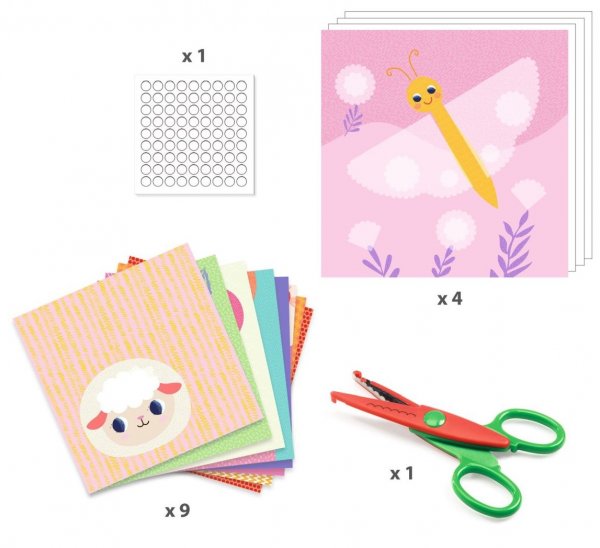Inhalt: 9 illustrierte Bögen zum Ausschneiden, 4 illustrierte Karten zum Verzieren, 1 gezahnte Schere, 1 Bogen mit doppelseitigen Aufklebern und 1 Schritt-für-Schritt-Anleitung.