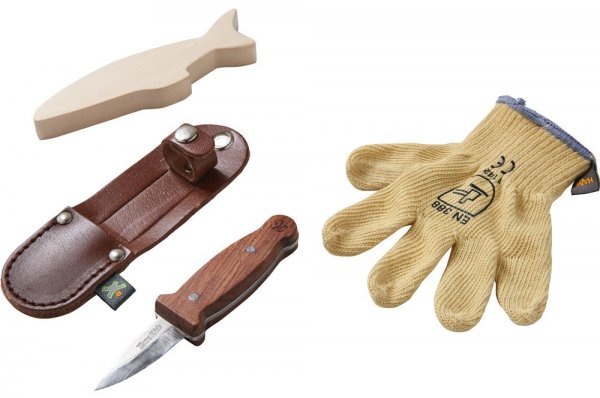 Das Terra Kids Schnitzset besteht aus einem Handschuh mit Schnittfestigkeit 4 für Rechts- und Linkshänder geeignet, einem extrarobusten Messer mit Tasche sowie einem Lindenholz Rohling.