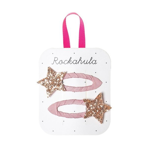 Dieses niedliche Rockahula Kids Haarspangen Set Sterne in rosa verzückt jedes kleine Mädchen! Die Haarspangen sind mit einem altrosafarbenen Band bezogen und mit einem rosa glitzernden Stern verziert.